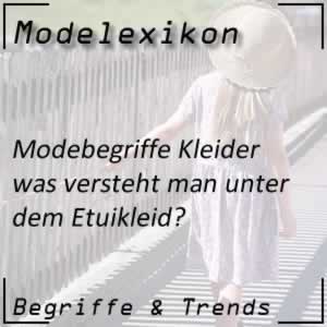 Das Etuikleid ist in der Grundkonzeption ein figurbetontes Kleid, das knielang gearbeitet wird. Meistens gibt es ein rundes Dekolletés, ein Kragen findet nicht statt. Wesentlich bei der Gestaltung dieses Kleidungsstücks ist die Tatsache, dass die übliche Taillennaht fehlt, wodurch es auch nicht zu der Taillentrennung kommen kann. Damit wirkt das Kleid optisch völlig anders als die meisten anderen Modelle. Bekannt geworden ist diese Kleidervariante schon in den 1930er-Jahren, verschwand dann aus der Modewelt und feierte in den 1960er-Jahren seine Rückkehr.
