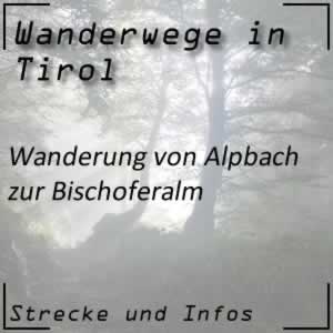 Die Wanderung von Alpbach auf die Bischoferalm wird dann Richtung Osten in einem Bogen weitergeführt und schließlich nach Süden und bergab zum Ausgangspunkt abgeschlossen. Der Rundwanderweg ist mit knapp 7 Kilometer Strecke einer der kürzeren und man überwindet 450 Höhenmeter. Damit ist die Route auch nicht besonders schwer und bietet einen schönen Ausblick über die Bergwelt. Der höchste Punkt ist auf 1.326 Meter Seehöhe erreicht.